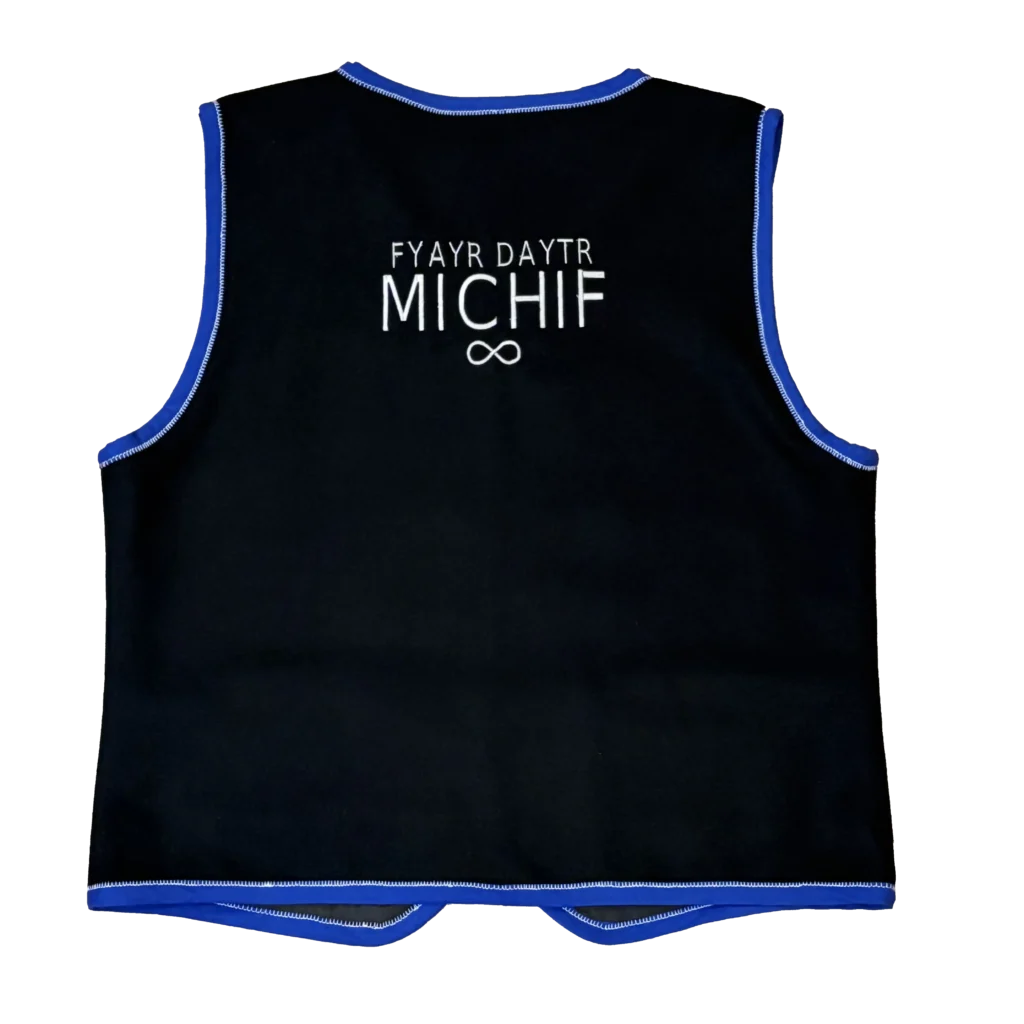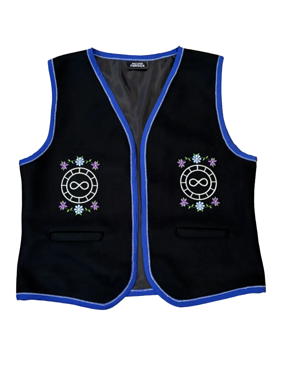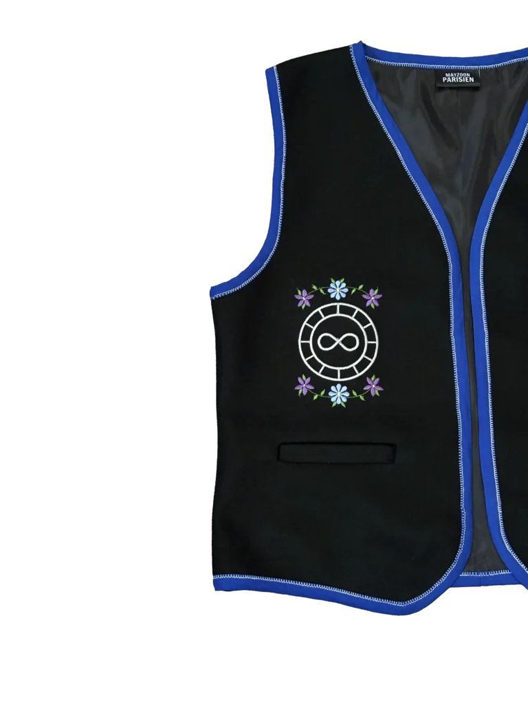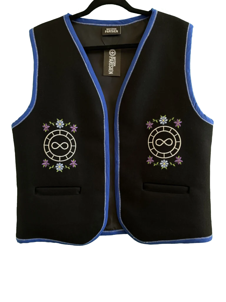 This vest is made of melton cloth fabric and lined with 100% polyester lining. The vest features two welt pockets on either panel. The panels also feature the Métis infinity symbol, surrounded by a stylized version of the red river cart wheel . As well as a floral motif representing Métis floral beadwork.