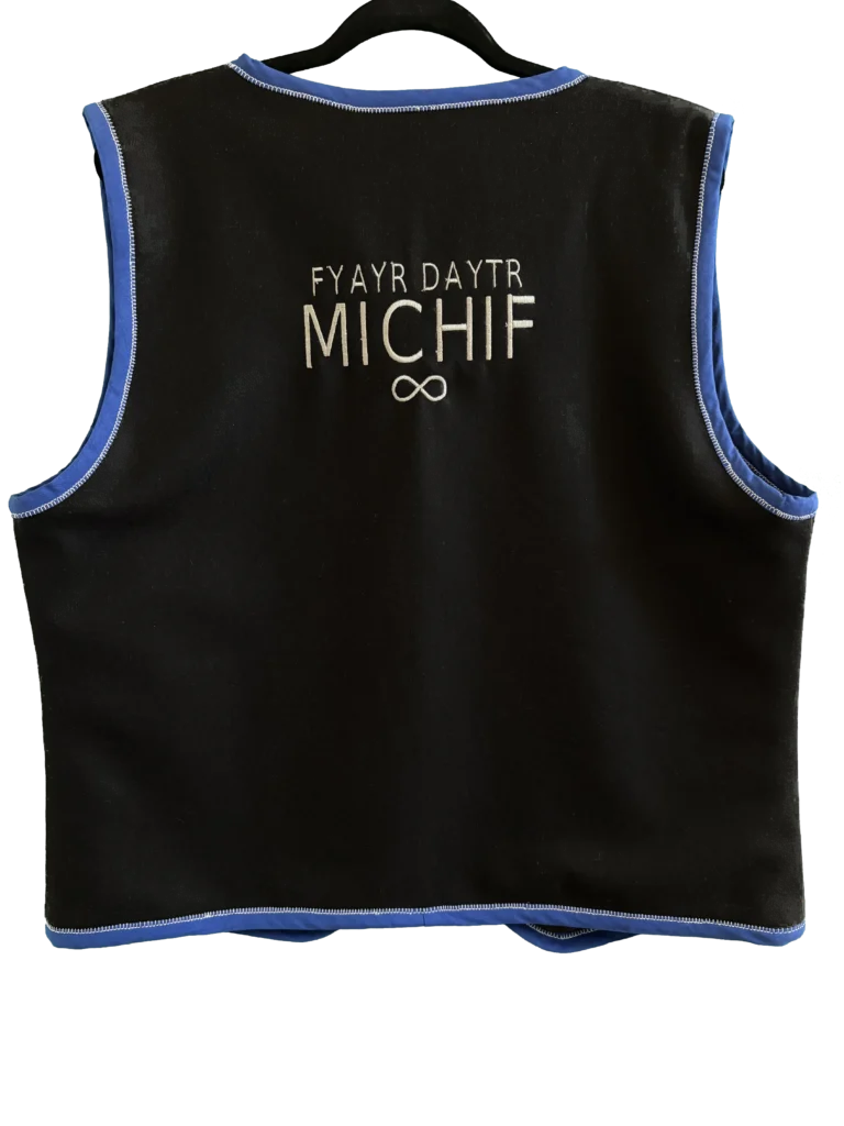On the backside of the vest is the words “FYAYR DAYTR MICHIF” which translates to “Proud To Be Métis” in English. As well as the infinity symbol. The vest was finished with blue bias tape and white stitching which was chosen to represent the Métis flag. Finally, the white stitching also represents mouse tracks which are a common motif in Métis beadwork.