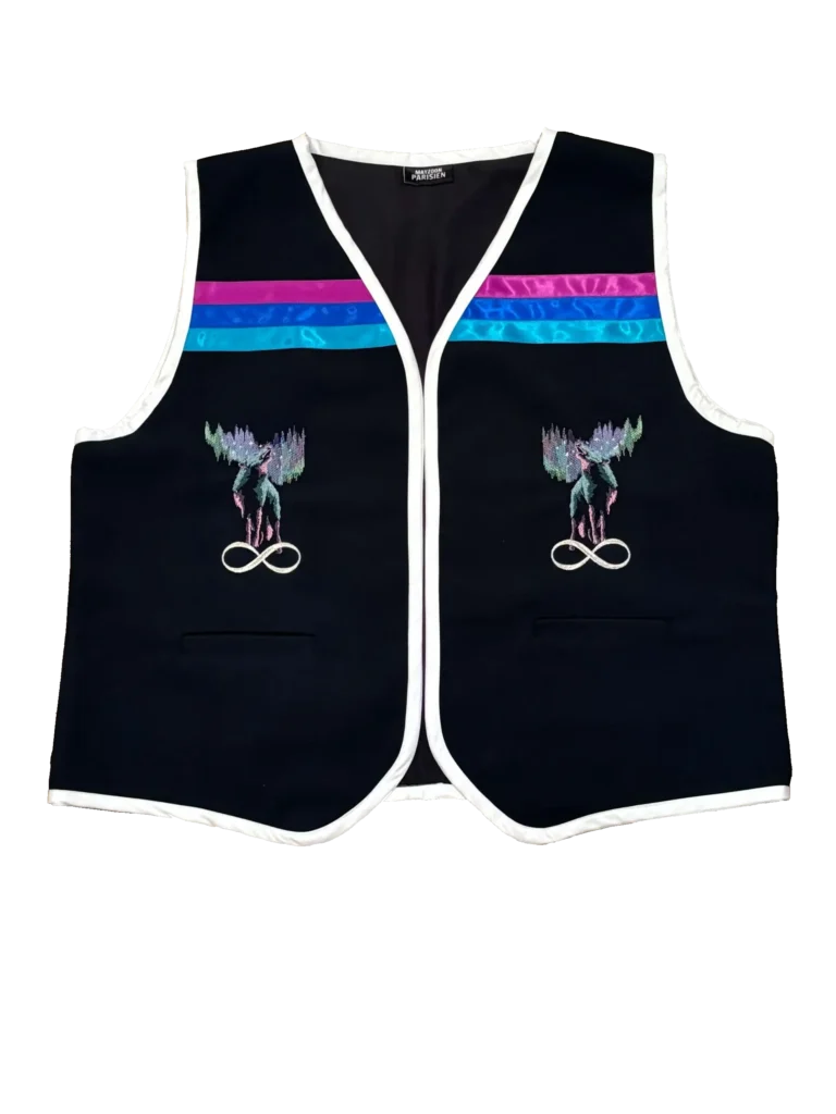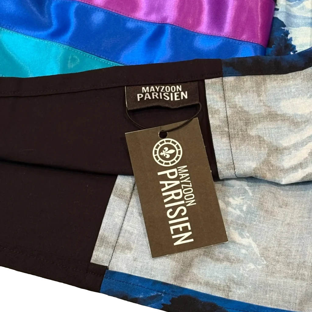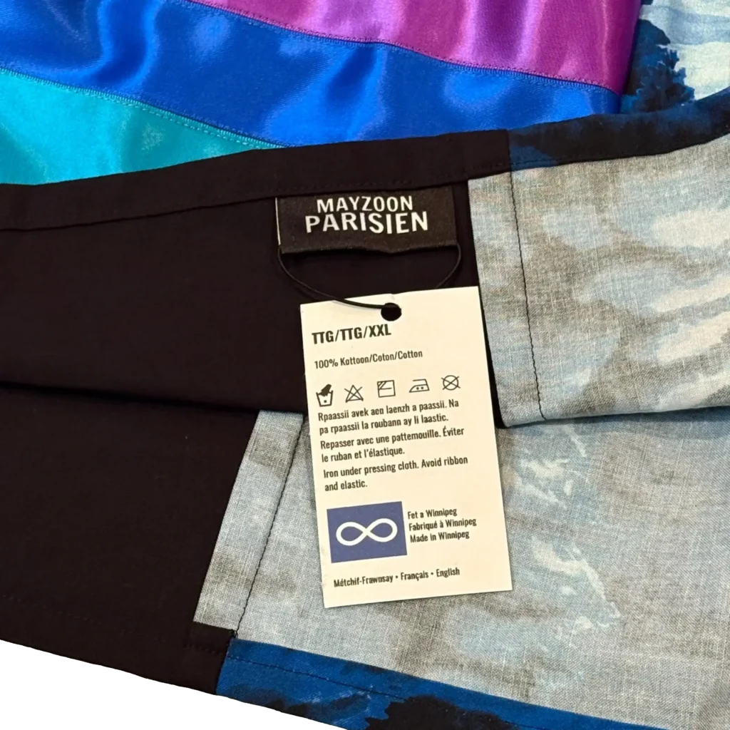 This skirt was created from six rectangular panels of 100% light-medium weight cotton fabric. The sides of the skirt feature large side-seam pockets. As well as, 1.5″ purple, blue, and turquoise ribbons, which draw from the colours of the northern lights.