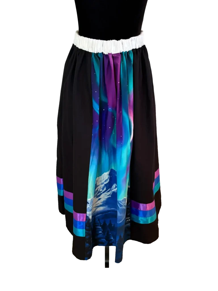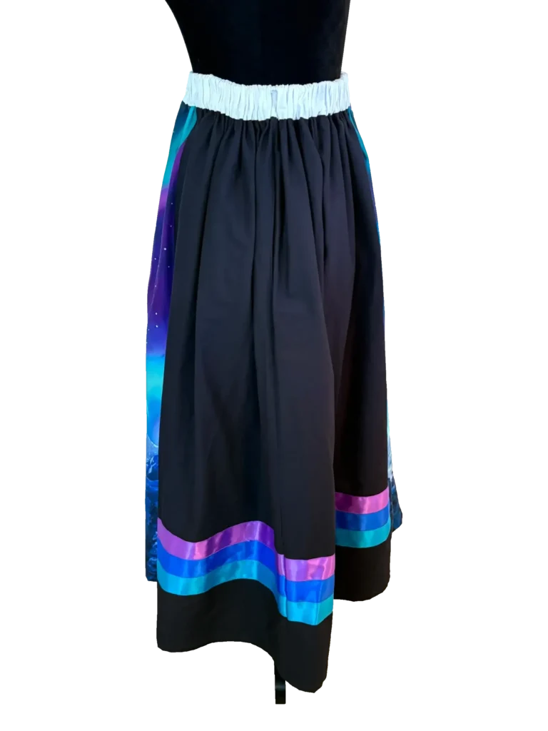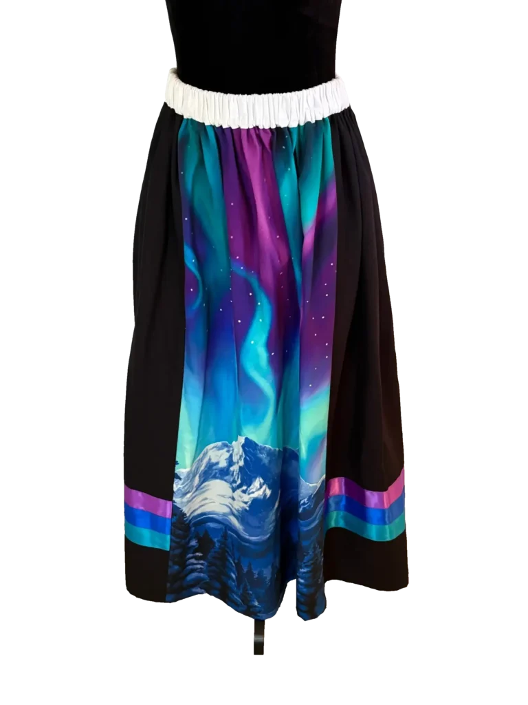 The front and back of the skirt feature the northern lights over a mountainous and snowy landscape. All of these panels are then gathered with elastic into the white waistband. This creates a very full bell shape skirt.