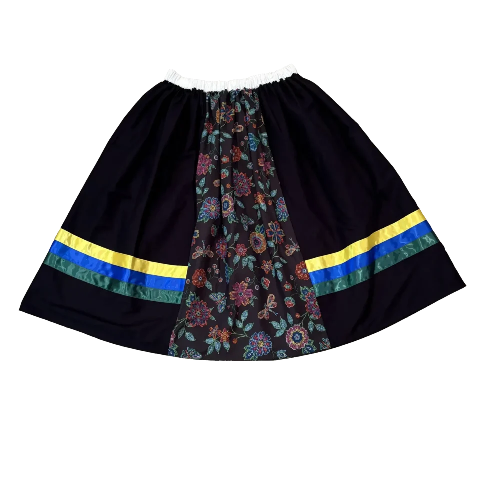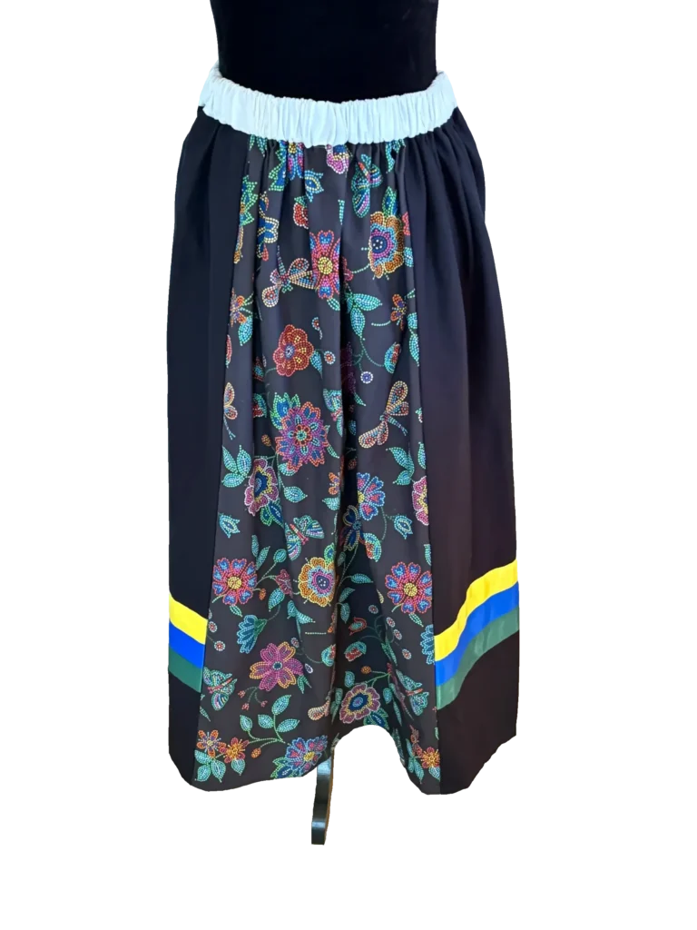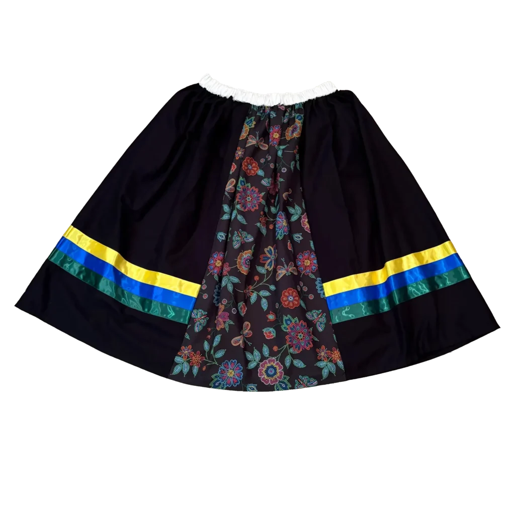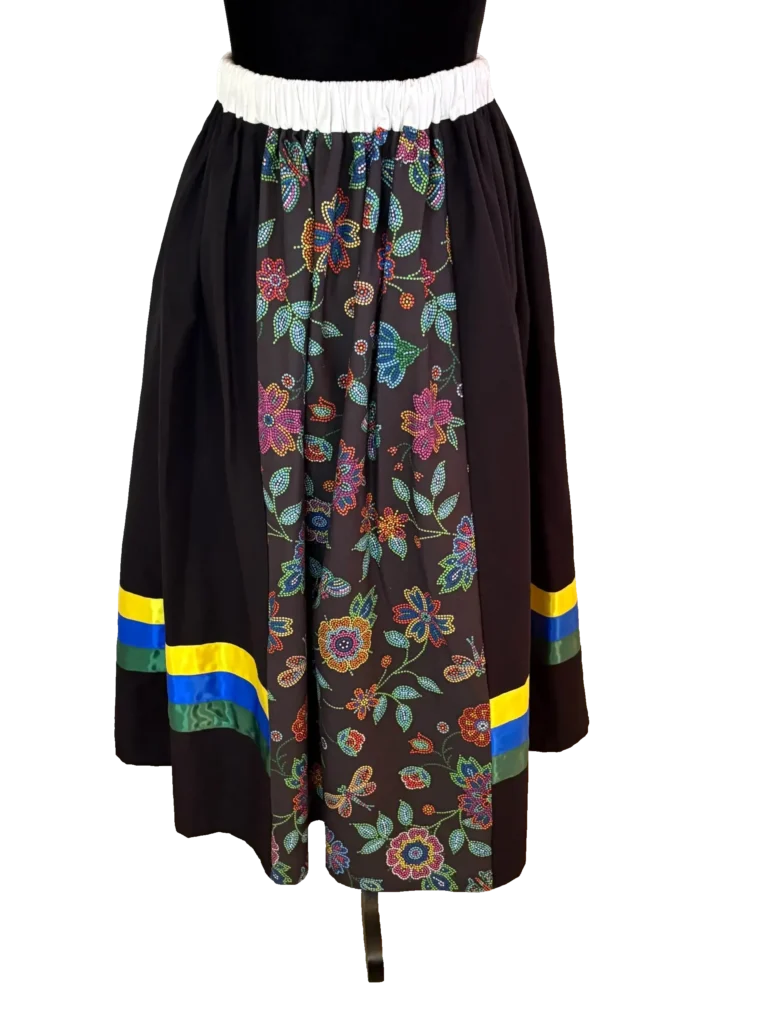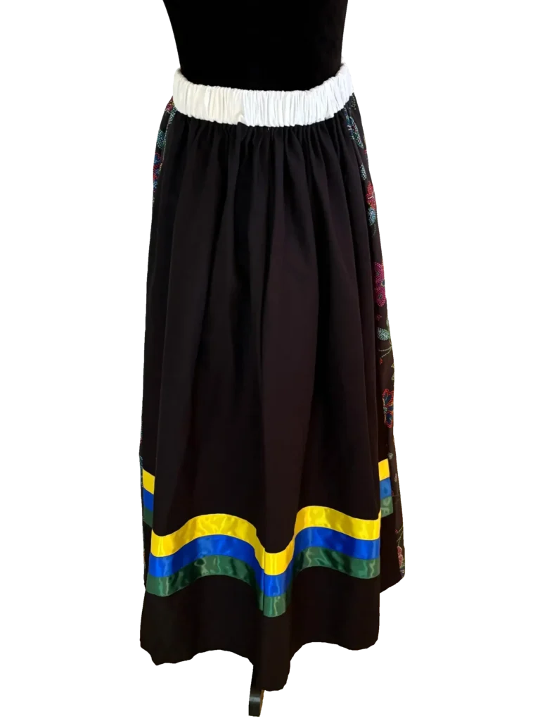The front and back of the skirt feature a beaded floral pattern. All of these panels are then gathered with elastic into the white waistband. This creates a very full bell shape skirt.
