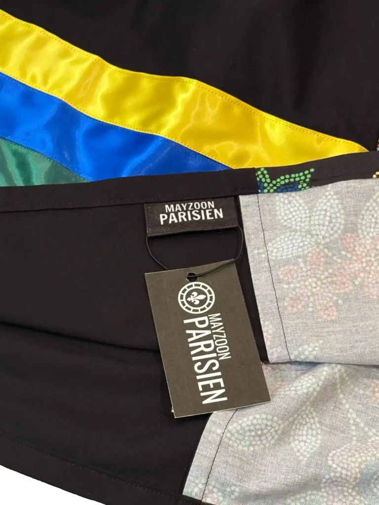 This skirt was created from six rectangular panels of 100% light-medium weight cotton fabric. The sides of the skirt feature large side-seam pockets. As well as, 1.5″ yellow, blue, and green ribbons. The yellow represents the sun, the blue represents the sky, and the green represents the land.